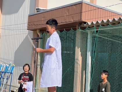 9月9日(月)児童朝会で、ヒゲをはやした博士が登場しました。手洗いのことと清潔検査のことを話していました。
