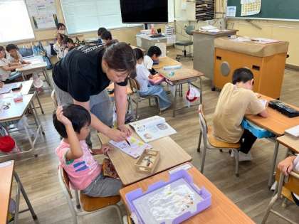 9月9日(月)3時間目、1年1組は国語で漢字の「七」と「八」を練習していました。