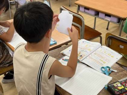 9月13日(金)1時間目、2年2組は算数で紙を折って直角を作り三角定規の直角の部分で本当に直角になっているか調べていました。