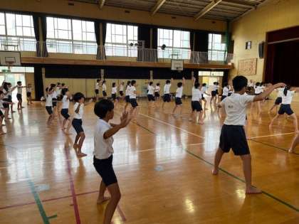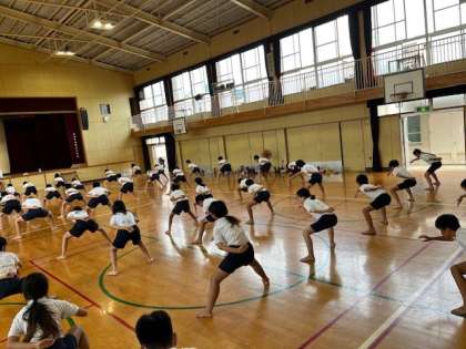 9月19日(木)1時間目、6年は体育館で南中ソーランの練習をしていました。足に力がかかるようで、登校時に足にシップを貼っている子がいました。