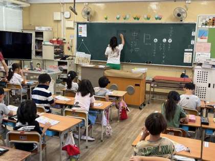 9月25日(水)1時間目、1年1組は国語で漢字の学習をしていました。「大」という感じは手足を広げた人の姿からできたと知り、「へー」という空気が教室に流れました。