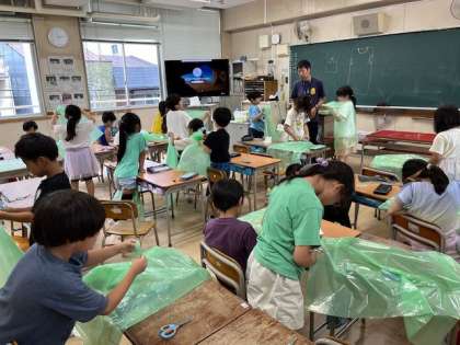 10月4日(金)3時間目、2年2組は学級活動で運動会で使う衣装を作っていました。