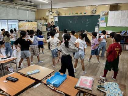 10月18日(金)1時間目、1年1組は演技のおさらいをしていました。黒板には「音」と「町」の漢字が書かれていましたので、漢字の学習を終えてから、机を動かして練習していたのだなあと思いました。