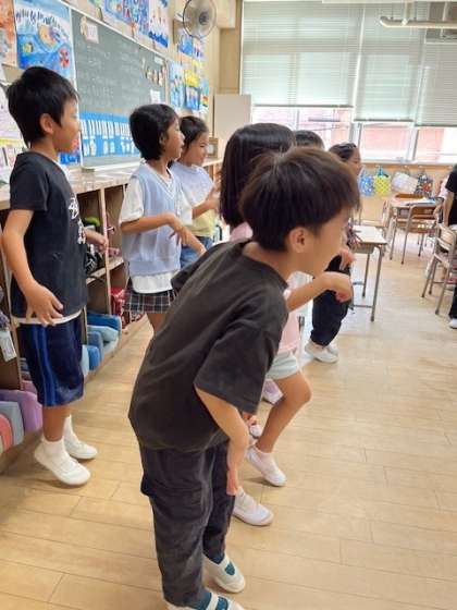 10月23日(水)1時間目、2年1組は生活科で「おいもパーティー」の練習をしていました。グループごとに分かれて練習していました。おいもダンスはユニークでつられて踊りそうになります。
