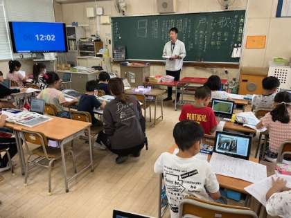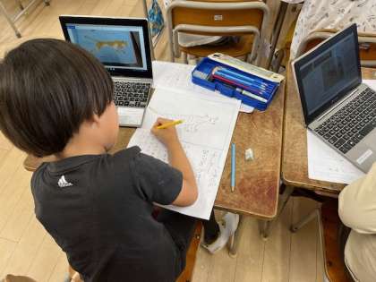 10月24日(木)2時間目、2年2組は国語でどうぶつカードを作っていました。図鑑パソコンで調べて、カードにまとめていました。