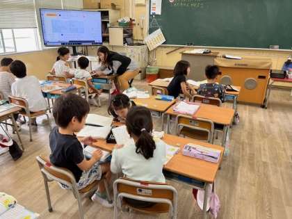 10月24日(木)2時間目、1年1組は算数で6+7の計算の仕方を考えて、近くの人と意見を出し合い考えていました。