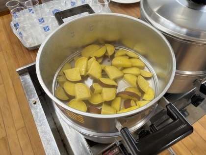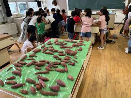 10月24日(木)5・6時間目、2年は生活科で「おいもパーティー」をしていました。最初は家庭科室へ行って自分が持って帰るおいものくじ引きをしました。家庭科室にはさつまいもを鍋で蒸かしていました。