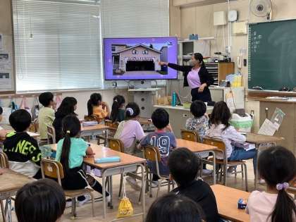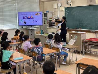 10月25日(金)3時間目、2年2組は外国語活動で先生からハロウインの話を聞いていました。ガレージを口に見立てた飾りを驚いて見ていました。