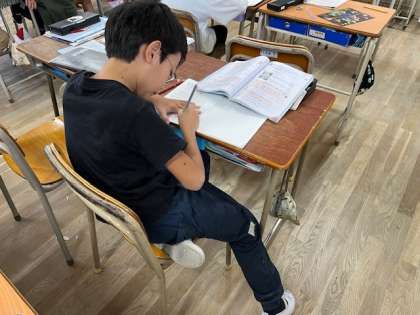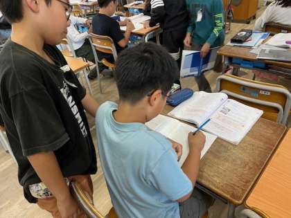 10月25日(金)3時間目、5年1組は算数で速さの比べ方を考えていました。単位量あたりの大きさは子どもにとって難しいですね。早くできた子が教えている姿もありました。