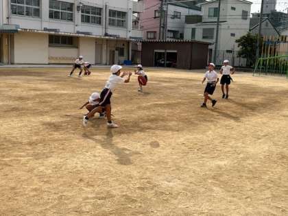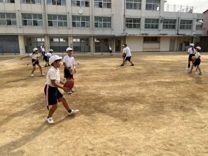 10月25日(金)5時間目、5年2組は体育でタグラグビーの練習をしていました。楕円のボールのパスを楽しんでいました。