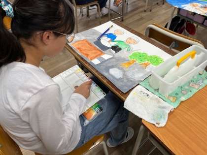 10月29日(火)2時間目、5年1組は算数の問題を終わった人から図工の絵の仕上げをしていました。
