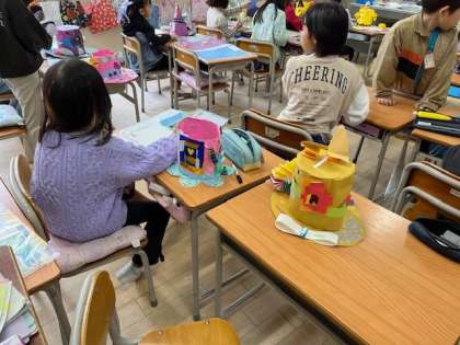 11月12日(火)2時間目、2年1組は図工で帽子つくりを終えて、がんばTっところや気に入っているところを書いていました。すてきな帽子がたくさんできていました。