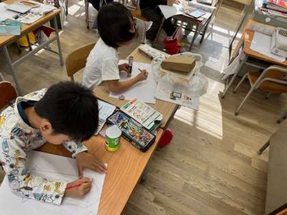 11月12日(火)3時間目、1年1組は算数で形を紙に写しとって絵をかいていました。