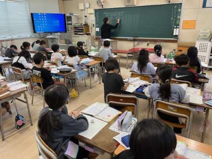 11月14日(木)1時間目、2年2組は算数で文章の問題をかけ算で考えていました。