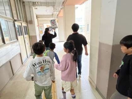11月15日(金)3時間目、たてわりなかよし集会がありました。たてわり班ごとに集まりクイズラリーでまわるコースを並んで歩く練習をしていました。