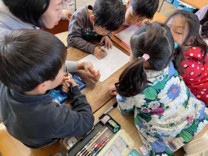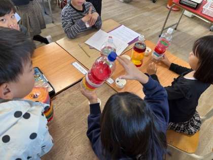 11月18日(月)1時間目、1年1組はグループに分かれておもちゃランドの準備をしていました。ペットボトルの上からどんぐりを入れ、何段かを落としていくおもちゃを遊ばせてもらいましたが、なかなかうまく下に落ちていかないので面白かったです。