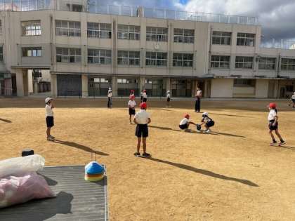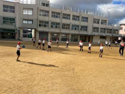 11月19日(火)1時間目、4年2組は体育でボールを両手に持って下から投げてパスの練習をしていました。タグラグビーの練習かと思ったら、両手で頭の上に持ってのパスが始まりました。サッカーのスローインの練習?バスケットボール?と思ってみていると、ポートボールのパスの練習でした。