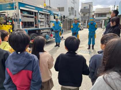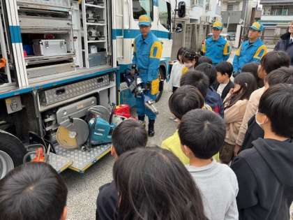 11月28日(木)3時間目、総合で地震の防災について調べているグループがレスキュー車を見学しました。機動隊の方に説明していただきました。大阪に3台しかない車で9月の石川県の豪雨災害で実際に出動したそうです。大小のチェーンソーやダイヤモンドの刃のついたカッター等を見せていただきました。