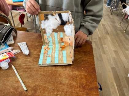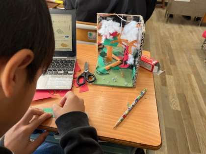 12月2日(月)5年2組は鏡を使った工作の工夫がどんどん進化してきていました。鏡の間にショートケーキを作っているとホールケーキに見えるものや今学習している「大造じいさんとがん」の一シーン等子どもの発想はすごいなあと思いました。