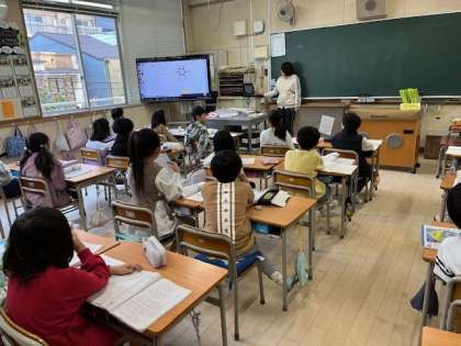 12月3日(火)1時間目、2年1組は算数でかけ算をつかったいろいろな考え方でおはじきの数を求めていました。