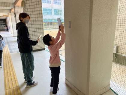 12月18日(水)1時間目、2年1組は算数で、子どもたちが「直角、直角」と言いながらパソコンをもって廊下をうろうろしているので、直角を探しているのかと思ったら、「長方形、正方形、直角三角形を撮影しよう」というめあてで教室から飛び出して探していました。
