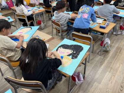 1月17日(金)1時間目、1年は1組も2組はプール水泳の絵を仕上げていました。