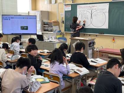 1月22日(水)3時間目、3年1組は国語でカミツキガメは悲しい生き物といわれる、その中身をベン図にしてまとめていました。