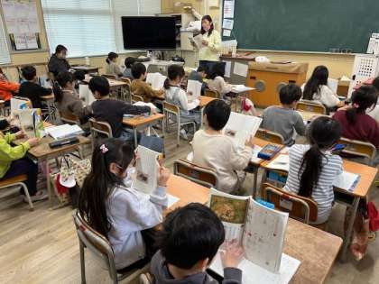 1月27日(月)3時間目、1年1組は国語で「子どもを まもる どうぶつ」の学習をしていました。全員で音読をしていました。