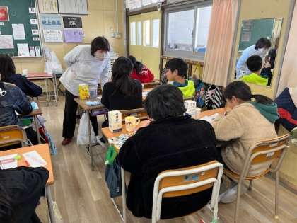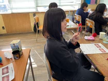 1月28日(火)3時間目、6年2組は歯と口の健康教室で歯垢が残っていないかを確かめていました。