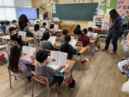 2月4日(火)4時間目、1年1組は国語で「子どもを まもる どうぶつたち」の音読を順番にしていました。