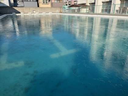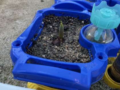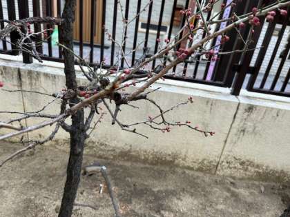 2月7日(金)学校の梅の木のつぼみがふくらんでいます。チューリップの芽が顔を出しています。春の訪れを感じますが、今日はプールの水が凍っていました。