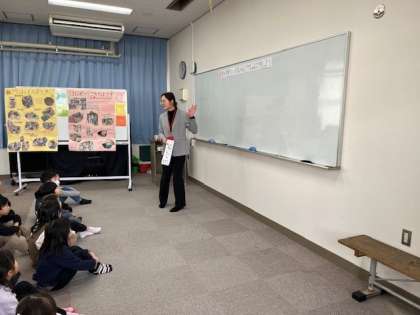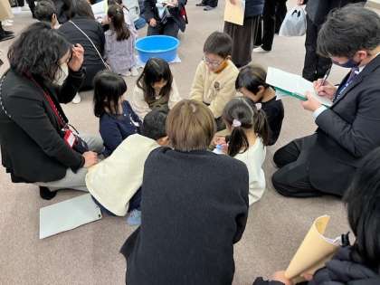 2月7日(金)5時間目、1年2組は生活科で「わいわいたんけんらんど」の準備をしていました。新しい1年生のために、学校は楽しいよということを知ってもらうためにどうしたらいいかをブースごとに考えていました。大勢の参観者をものともせず一生懸命考えていました。