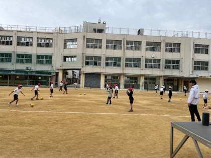 2月12日(水)1時間目、4年2組は体育で鬼ごっこをしていました。準備運動のようで運動場を走り回っていました。その後サッカーの練習をしていました。