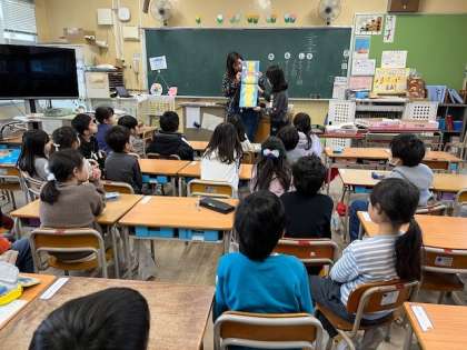 2月14日(金)朝読タイム。1年1組では図書委員が読み聞かせをしていました。縦に長い絵本で子どもたちは真剣に聞いていました。