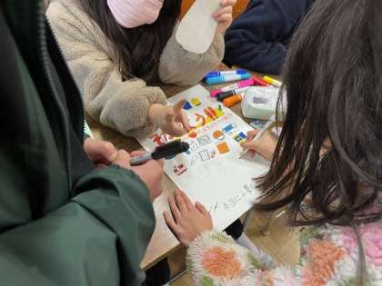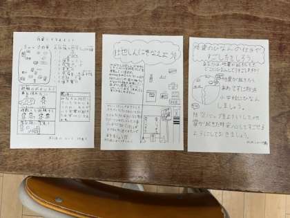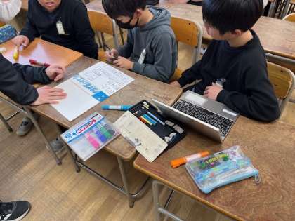 2月14日(金)4時間目、4年はグループに分かれて防災で学んだことを伝えるためにポスターを作ったり、ちらしを作っていました。