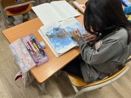 2月19日(水)1時間目、1年1組あ国語でスイミーの場面に吹き出しを書いて気持ちを表そうとしていました。まぐろに「ガオー」と吹き出しをかいている子がいました。