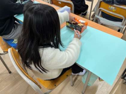 2月20日(木)2時間目、2年1組は算数ではこの形の学習をしていました。箱の面を画用紙にうつしていました。