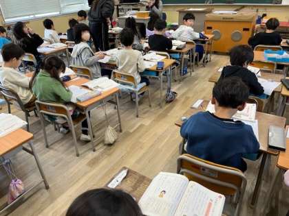 2月25日(火)1時間目、1年2組は国語で「小学校の ことを しょうかいしよう」を学習していました。ワークシートにこの一年を思い出して書いていました。