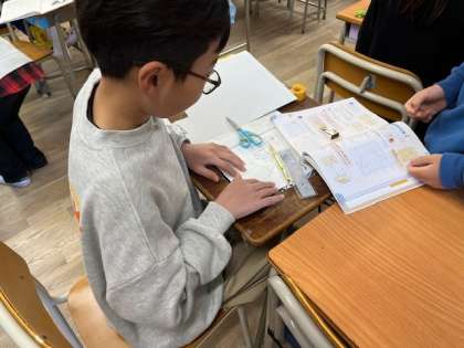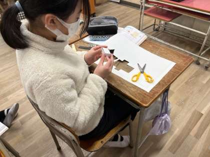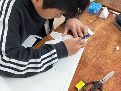 2月25日(火)1時間目、5年1組は算数で三角柱の展開図を書いて切り抜いてできるか確かめていました。