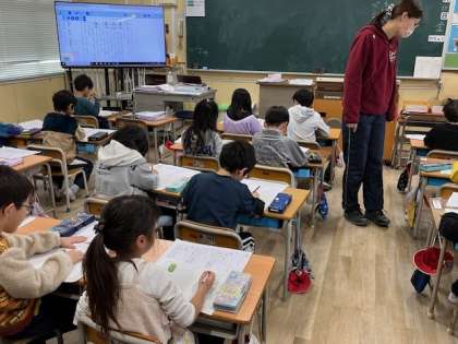 2月28日(金)1時間目、1年2組は国語で小学校の一年間の出来事を紹介する作文を書いていました。