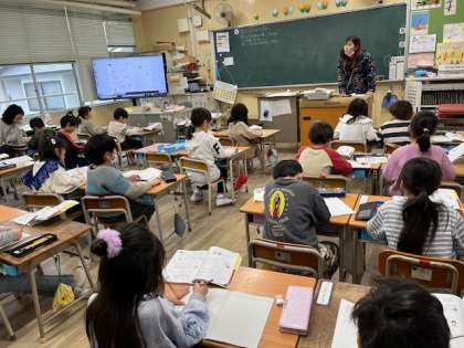 3月3日(月)1時間目、1年1組は算数で問題を読んで、たし算かひき算を考えて式をたてていました。