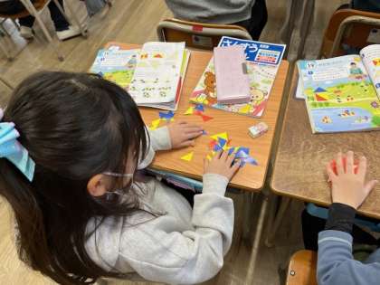 3月6日(木)1時間目、1年1組は算数で「かたちづくり」を学習していました。三角形を組み合わせて形を作っていました。パズルで遊んでいるように見えましたが、子どもたちは真剣でした。