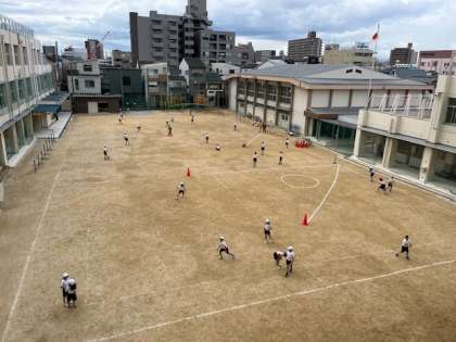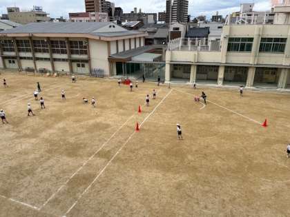 3月6日(木)5時間目、3年は体育で小さなボールを投げ合っていました。運動場に描かれた線を見ると、Tボールをするようです。