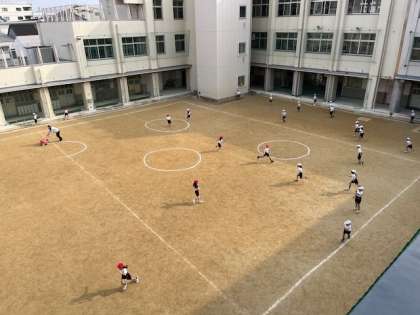 3月13日(木)1時間目、1年は体育で準備運動の後、鬼ごっこで体を温めていました。準備運動の姿を見ると、入学したころより一回り体が大きくなっているように感じました。グループになって中あての練習をしました。上手にボールを投げたり、逃げたりしていました。