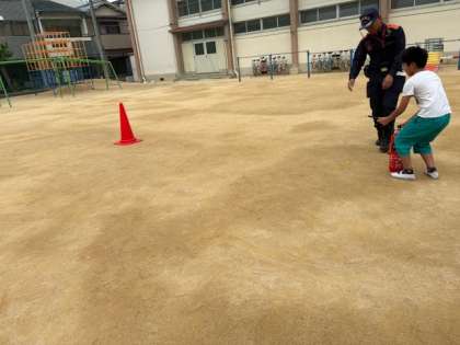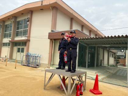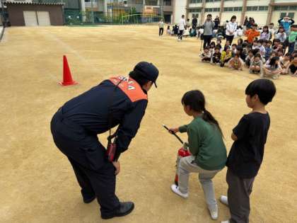 消防署の方に使い方を教えていただき、実際に体験しました。合言葉は「ピン、ポン、パン」です。