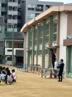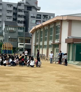 運動場に並んで、集会委員会の児童によるマルバツクイズをしました。