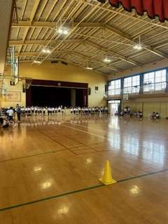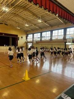 シャトルランの測定をしていました。シャトルランの音とアナウンスに合わせて、各自の体力に合わせて走ります。