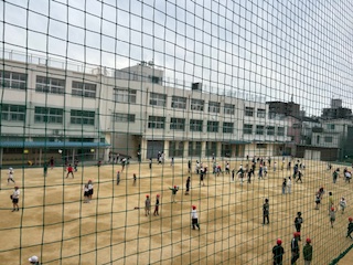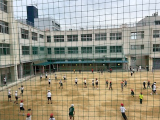 少し曇っていますが、たくさんの子どもたちが運動場で過ごしています。
