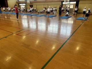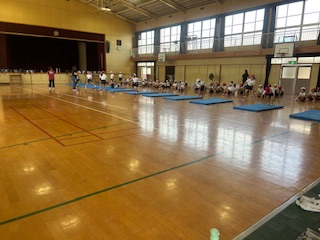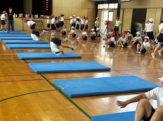 後ろ向きで準備、順番にマットについて最後の仕上げでは、腕でしっかりマットを押して起き上がる!後転!