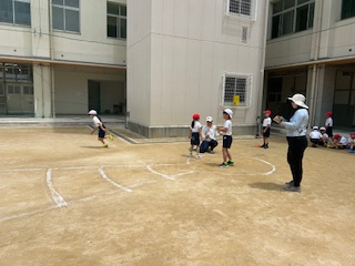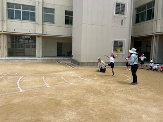 ボール投げの記録をとっていました。大きめのボールをしっかり持って、弾みをつけて投げます。